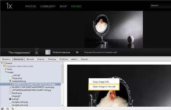 把 Image 标签展开,你就会看到当前网页的所有图片都在里面,包括你想下载的那张,而且这是图片源,大小是源文件的尺寸!直接在图片上按右键选择在新标签页打开,就可以保存图片了: